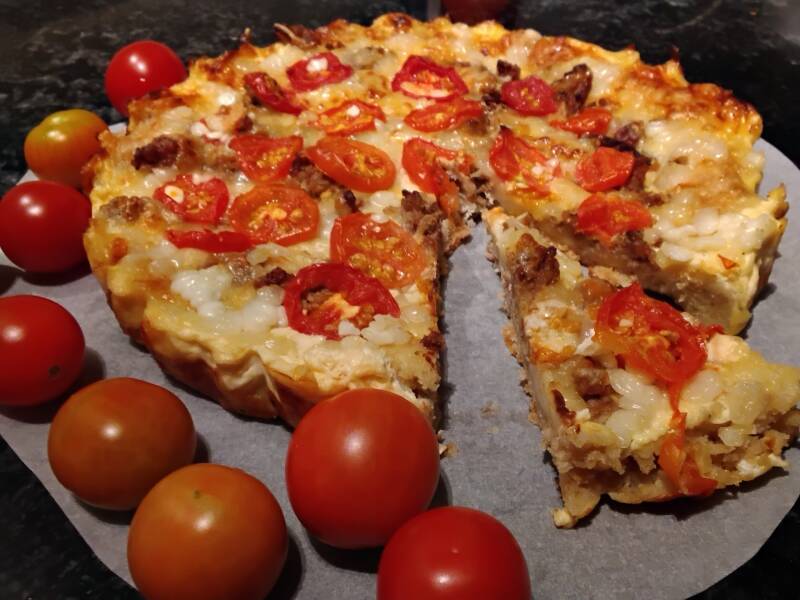 Yksi herkku, jota koristamaan käyvät juuri tomaatit, on jauhelihapiirakka,