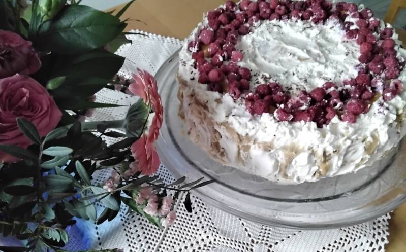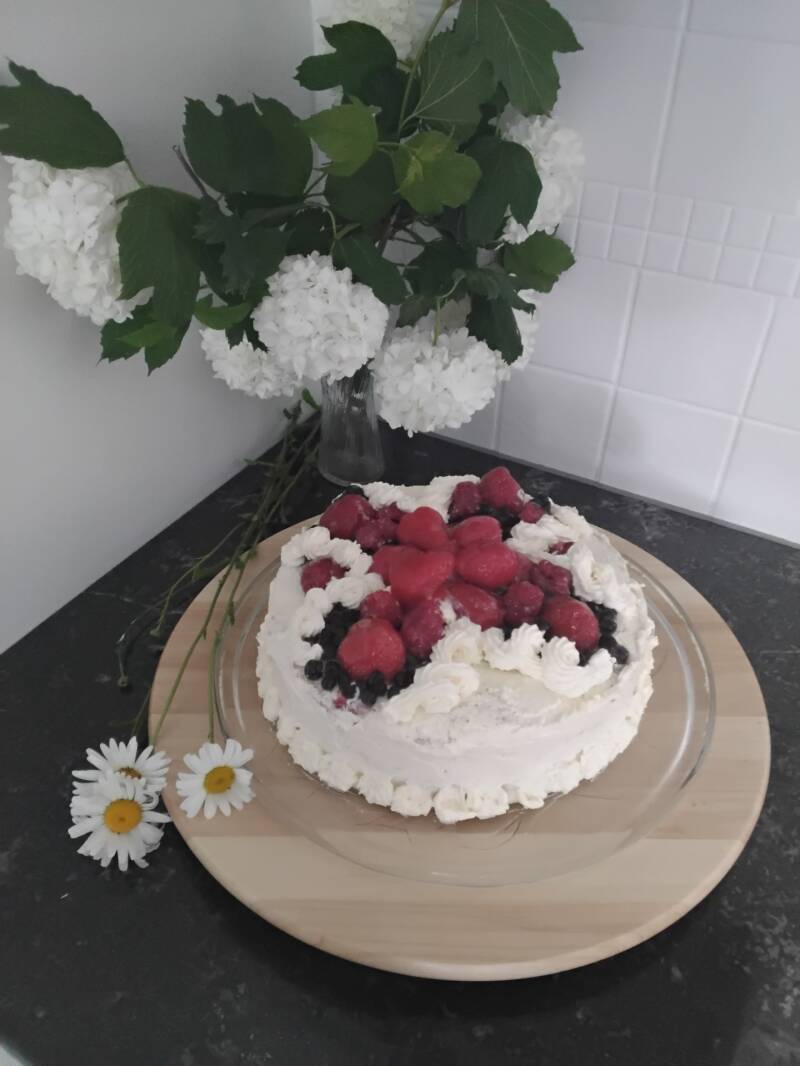Juhannusvieraille leivoin täytekakkua uuden sadon mansikoista.