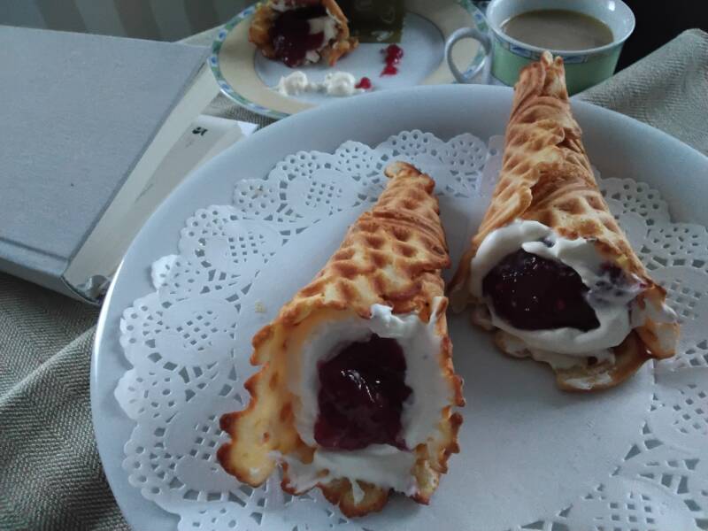 Taikinana aivan tavallinen vohvelitaikina, mutta tarjoilumuoto tötterö.