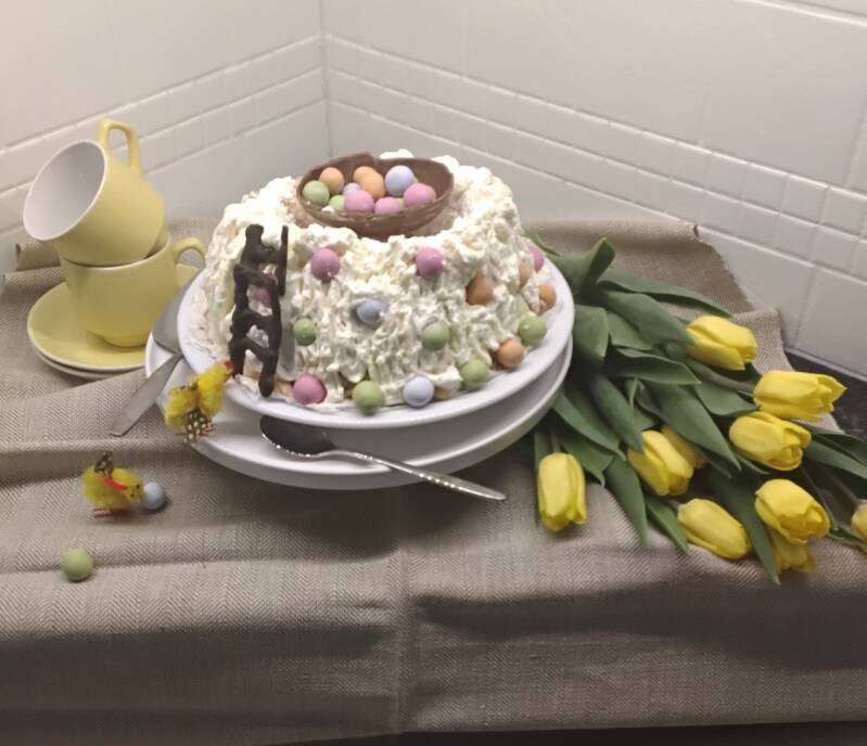 Pääsiäiseksi mansikkamoussella täytetty täytekakku Pääsiäiskoristein.