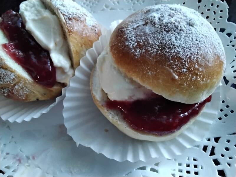 Täytteenä omissa pullissa on lähes joka vuosi jo perinteisesti kermavaahto ja vadelmahillo.