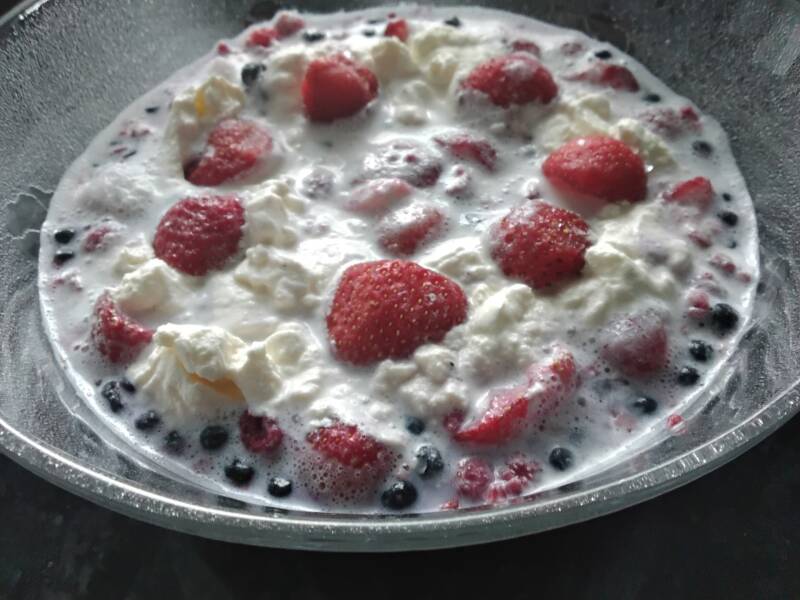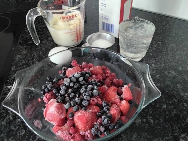 (Itse käytin mansikoita, mustikoita, vadelmia ja mukaan lisäsin muutaman puolukan.