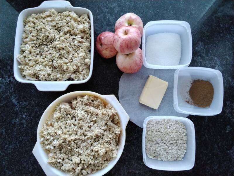 3. Sekoita sulatettu rasva, sokeri ja kaurahiutaleet ja kaada seos omenoiden päälle.