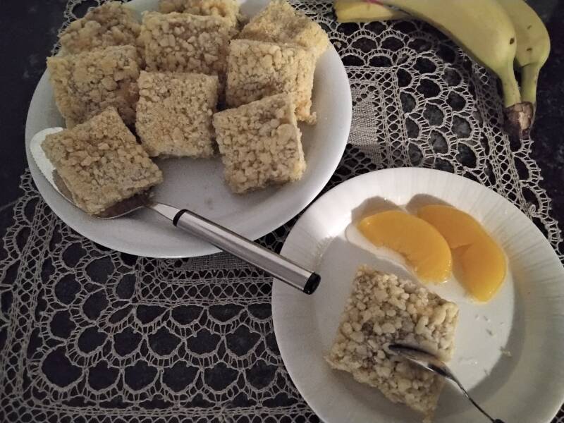 -Soseuta sekä banaani, että persikat ja levitä piirakan päälle.