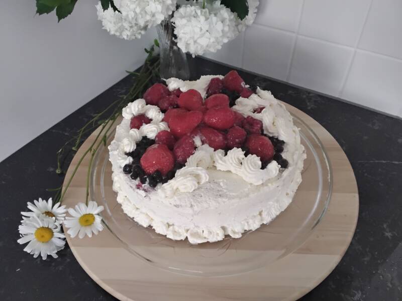 Kakun reunoille levitin kermavaahtoa, niin paljon, että kakku peittyi kerman alle.