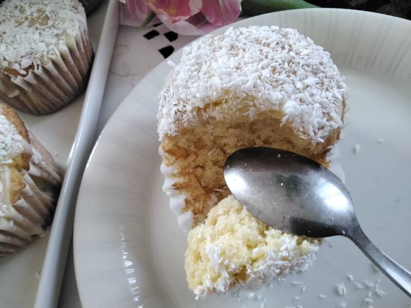 Levitä kuorrutus muffinien päälle ja koristele kookoshiutaleilla.