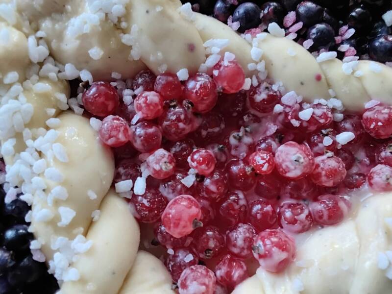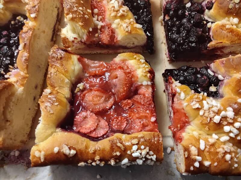 Sen jälkeen sipaisu vaniljakreeemijauhetta taikinalohkoihin ja päälle marjoja joihin sekoitin lusikallisen hedelmäsokeria sekaan kuhunkin.