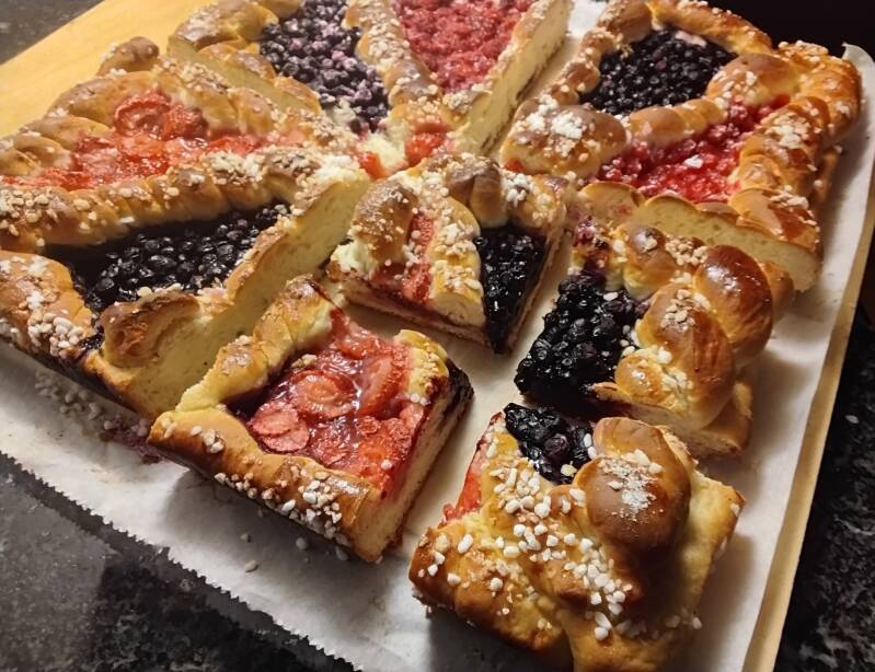 Pohja sai vielä nousta pellillä sen aikaa, kun pyörittelin lopputaikinasta muutaman pitkän pullataikinasuikaleen, joita kiersin aina kaksi yhteen. Näitä käytin eri sektroreiden tekemiseen.