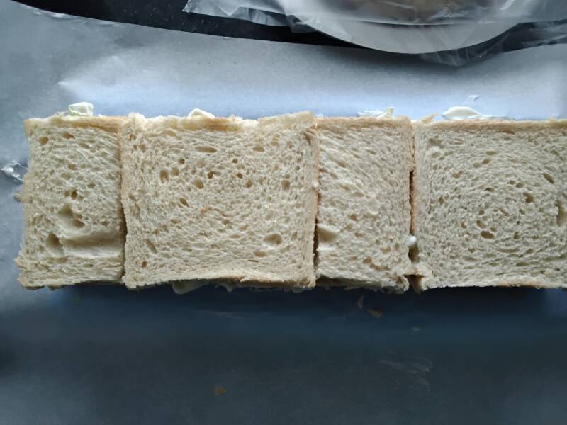 Ensinnäkin tein kakun kaupan kaurapaahtoleivästä. Leikkasin paloista reunat pois, ja asettelin aina kolme leipäpalaa kerrokseen. Kostukkeena käytin lihalientä.