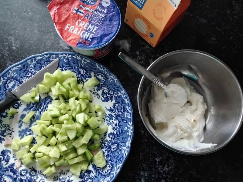 Pilkoin kurkkua pieniksi paloiksi ja sekoitin joukkoon creme faichea ja maustamatonta kermavaahtoa.