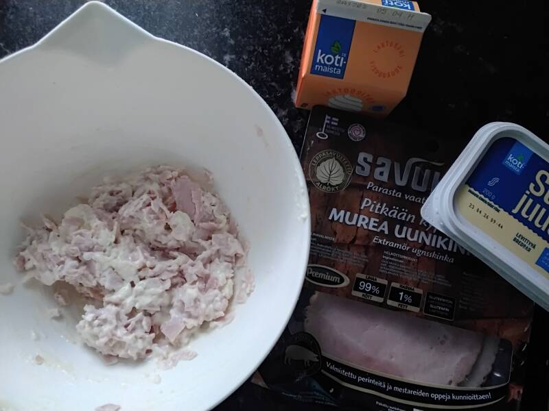 leikkelin kinkkusiivut pieniksi paloiksi ja sekoitin joukkoon puolipakettia sulatejuustoa ja kolmisen ruokalusikallista maustamatonta kermavaahtoa..