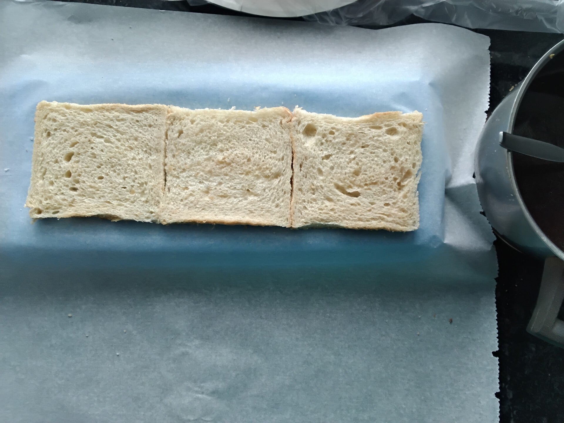 Asettelin palaset lomittain, eli ensimmäinen kerros kolme viipaletta peräkkäin, ja seuraavan kerroksen aloin puolikkaalla palalla. Kolmannen kerroksen