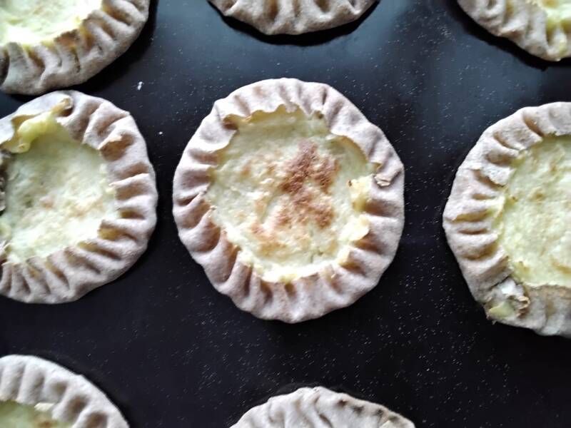 Paista perunapiirakoita 300-asteisessa uunissa noin 12 minuuttia, kunnes ne ovat kauniisti ruskistuneita.