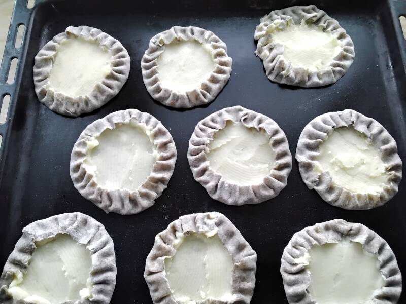 8. Siirrä piirakat uunipellille leivinpaperin päälle.