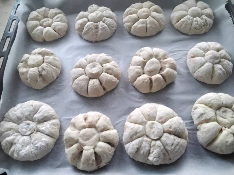 Toki sämpylöitä voi myös tehdä vähän erilaisiakin. Täss kokeilin miten omenanlohkojaa voi käytää hyödyksi sämpylöiden teossa. Inspiraatio löytyi täältä netin ihmeellisestä maailmansta. Hyvinhän niistä sai eri näköisiä. Ensin pyöritin taikinasta pyöreitä sämpylöitä, hieman jauhoja päälle ja painoin muotilla kuvan. Nyt täytyy huomioida vain se, että kun muottikuvion painoi sämpylään, eivät enää kohonneet uunissa muhkeiksi.